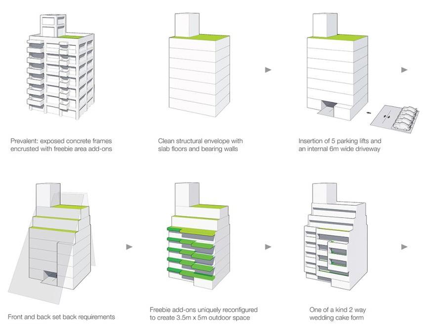 The creative solution of this urban housing project came from direct design responses to existing urban phenomena and rethinking legal constraints. Through the use of an ad hoc structural hybrid paired with concise geometric strategies, the unique stepped architecture form of the housing project achieves a striking purity, and created unparalleled benefits for both developer and housing occupants.