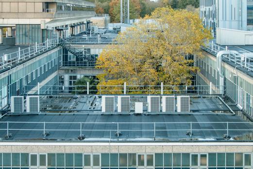 The PV panel area is set about 345 m², 7% of the total roof area, with the generation of energy for 23,444 kWh/yr. Most commercially available solar panels have an efficiency of less than 23%, with an average range of 15% to 20%. In order to meet the net-zero requirement, the PV panel area should up to 60% of the roof area. Based on the simulation, the surfaces that received the most amount of solar insolation are the two new sloping roofs faced towards the south, which is also where the PV panel is located. However, the roof of 4 East does not consistently get sunlight insolation as indicated by the solar study and simulation. Considering the price-performance ratio, it will spend more time and cost more than the energy saving. In other words, increasing the PV panel area is not a feasible option for meeting the goal.