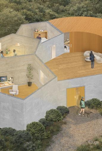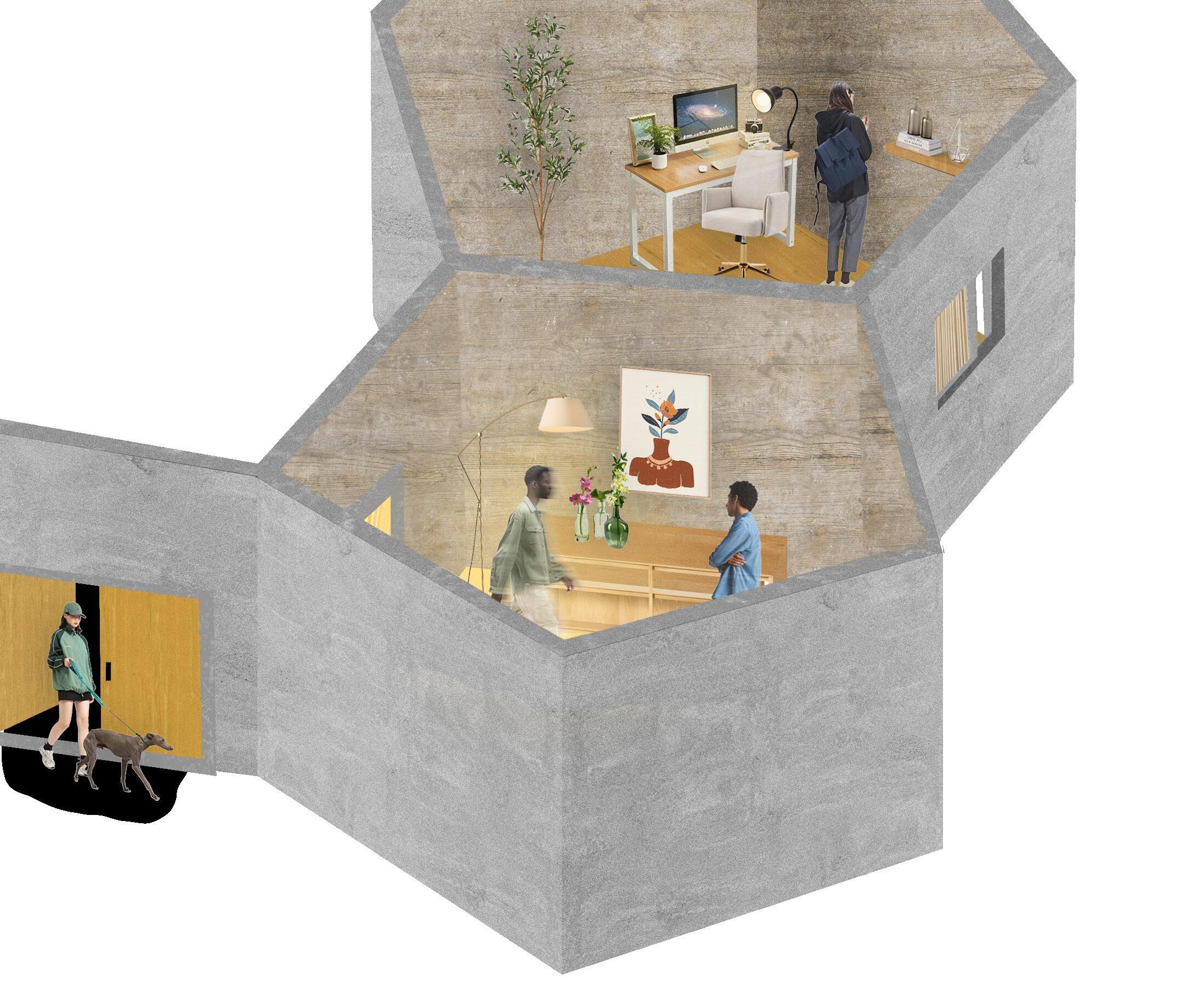 This project investigates modular student housing through a pentagonal geometry that challenges conventional orthogonal prefabrication. Using a modular pentagonal unit, the system explores how non-rectangle modules can create varied spatial conditions and communal spaces, maintaining efficiency in pre-fabrication and assembly.