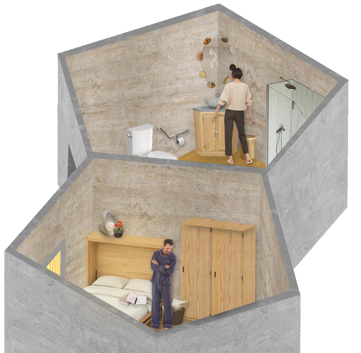 The design of a prefab (modular) accomodation intends to reach students of lower-middle incomes due to affordability, fast-construction, modernity, and energy efficiency, addressing problems with dorms. SPACE shared workplace communal cooking PRIVACY separate bedrooms specific zones
