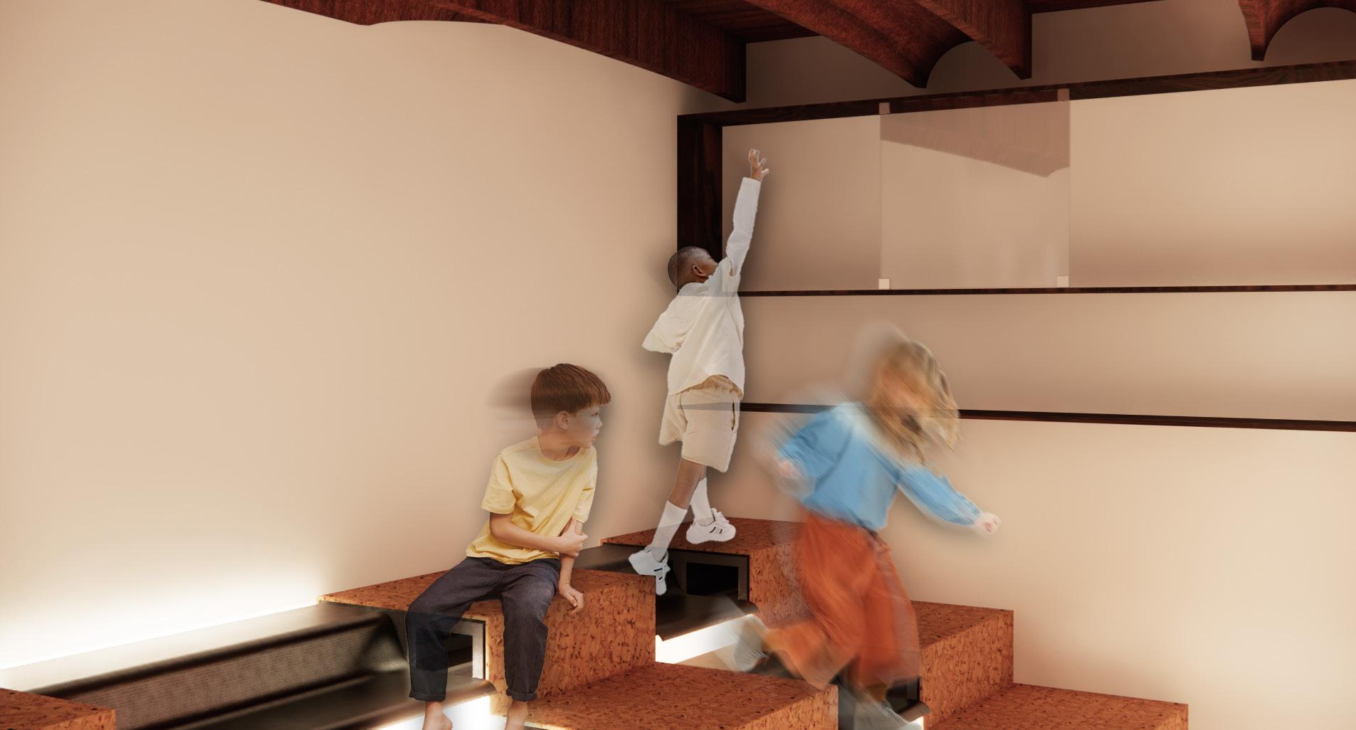 The proposed staircase design for the community center intends to explore two potential applications: a low, curvature staircase that functions as socializing and circulation, or a simple, linear staircase for the purpose of entry and exit, balancing sound reflectivity from the primary glass interiors with sound absorption from the incorporation of cork.
