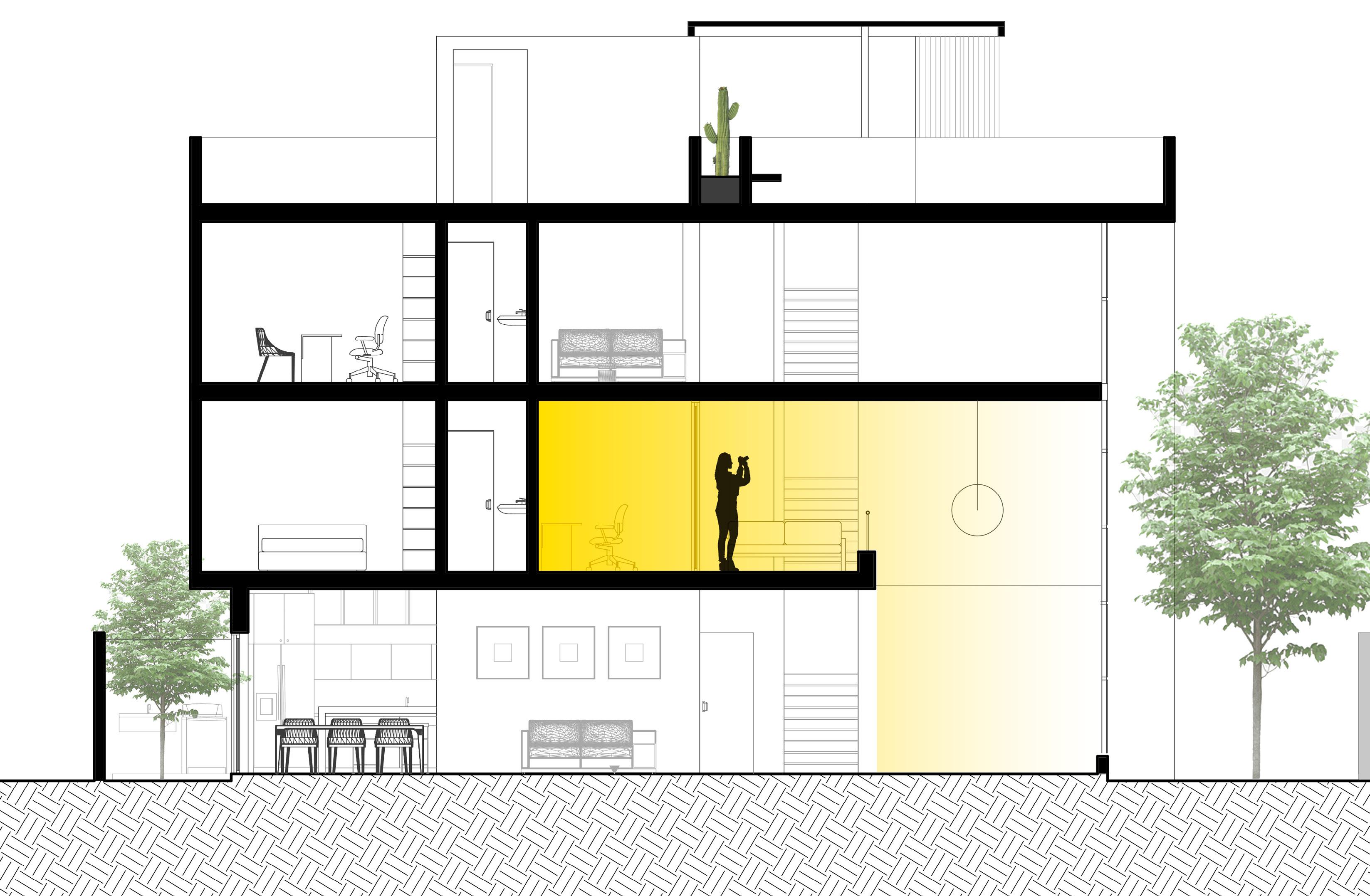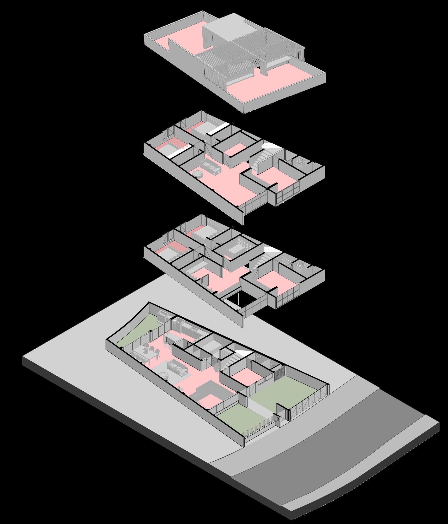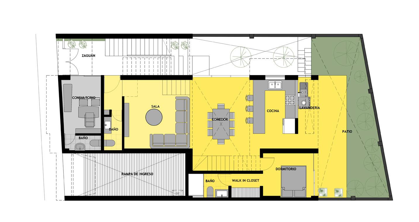 Este proyecto parte del análisis del corte y juego de plataformas, asi como el uso del color, con llenos y vacios que pretenden contener el vacio y controlar el ingreso de la luz.