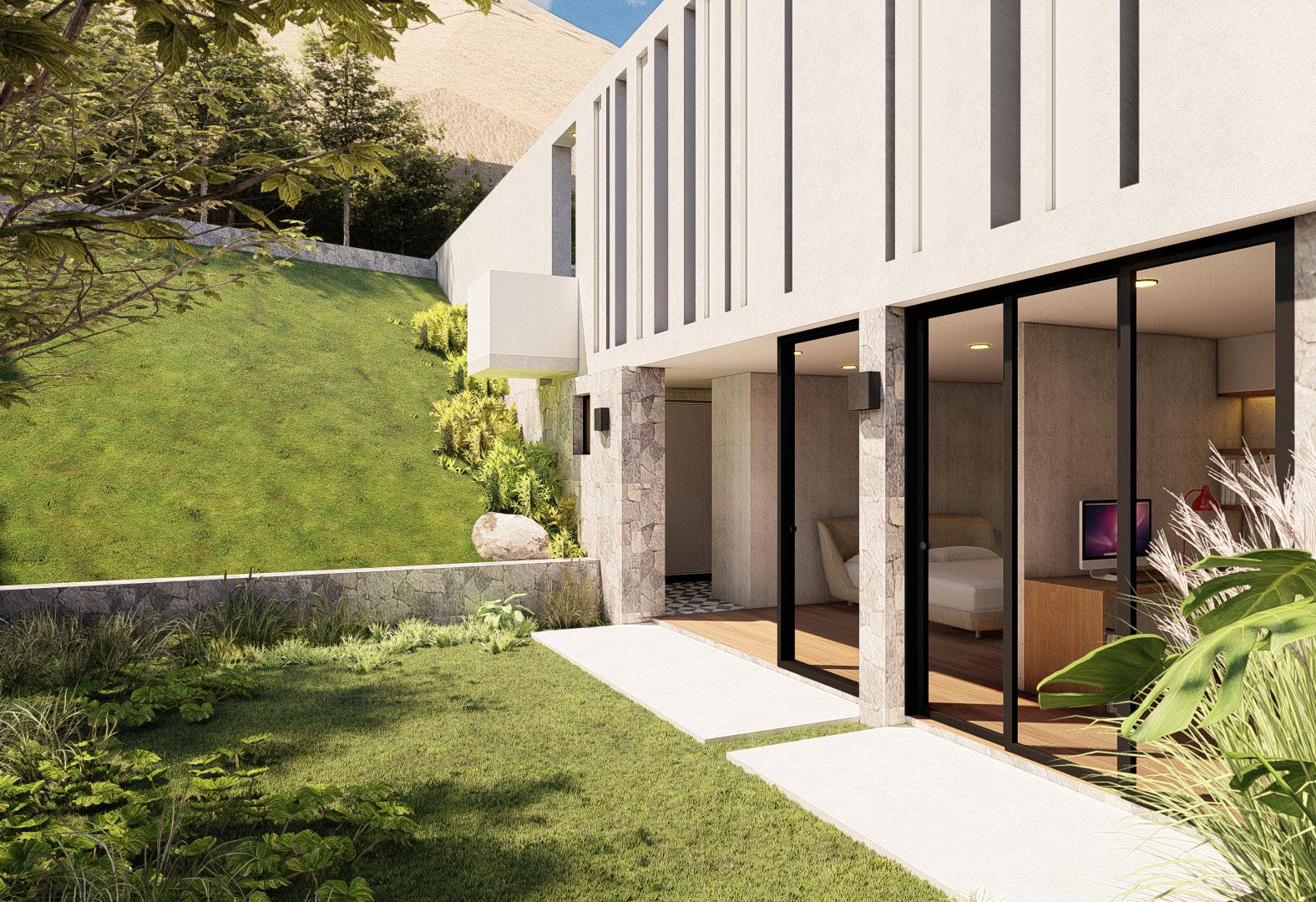 En este proyecto se pretende orientar el espacio social hacia el paisaje, generando una doble altura, que integra la sala con el estar del segundo nivel. Constructivamente se plantea una planta racional con ejes alineados en una trama hortogonal, con servicios nucleados y muros de carga que son continuas hasta el ultimo nivel.