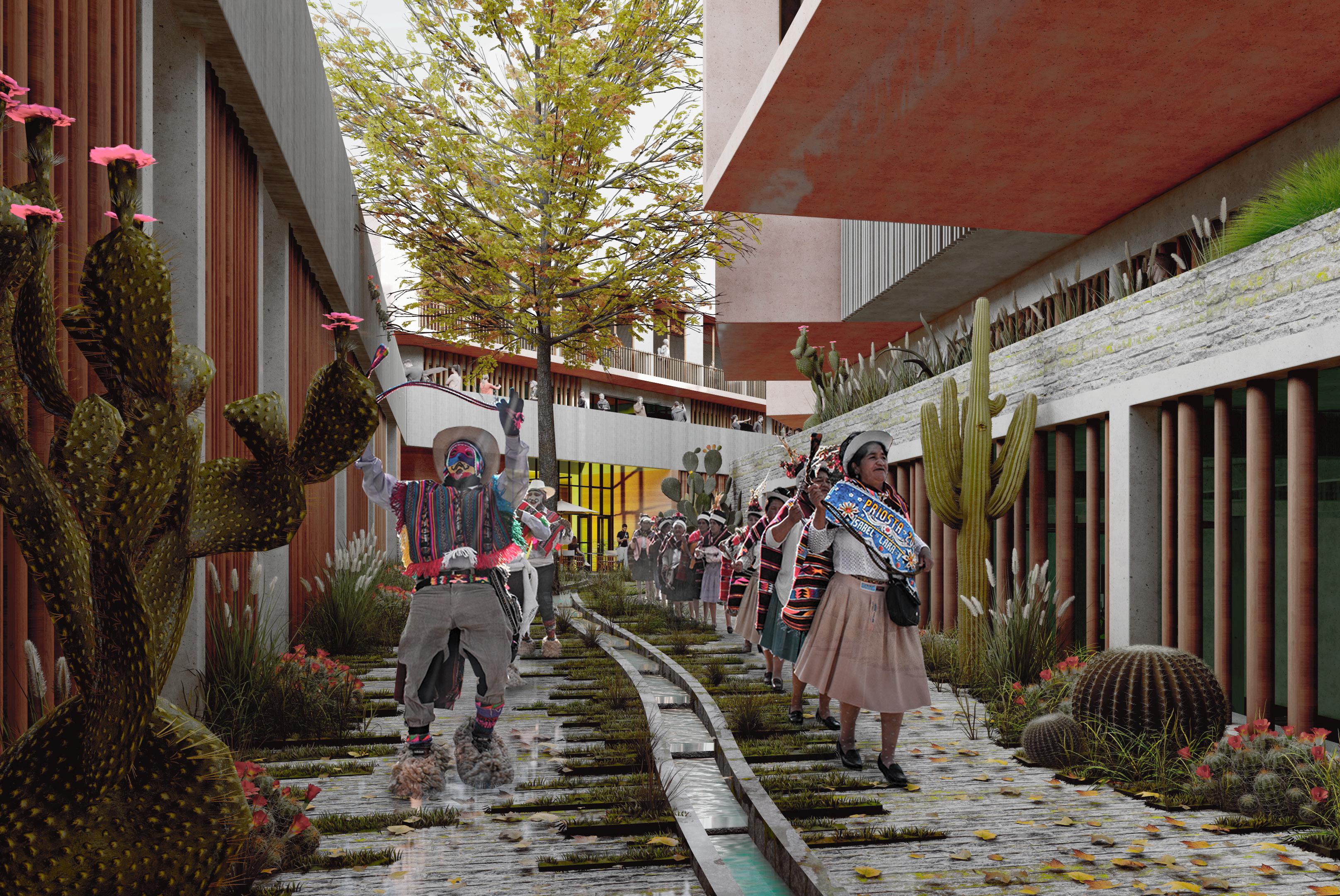 La calle interna pretende ser el espacio articulador de la edificación, trayendo a su vez el exterior al interior, para generar una conexión directa con el entorno y paisaje rural.
