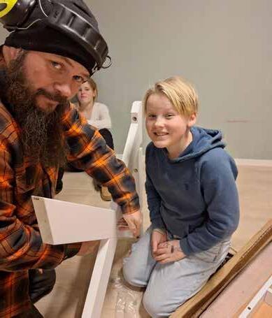 Cornelius Svendsen Grindflek får hjelpe av pappa Gaute til å skru sammen nye langbord.