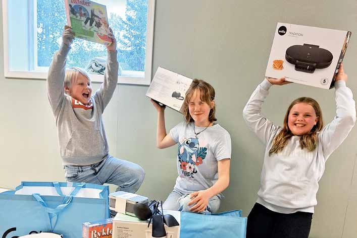 Cornelius Svendsen Grindflek, Inga Oline Breie Nystuen og Synne Romenstad fikk være med og pakke ut gaven vi fikk fra Fjøssystemer – Spill og kjøkkenutstyr.