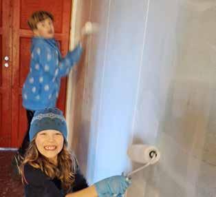 Etter flere kvelder med rydding og riving kunne vi begynne å male. Vi ungene var med på hele jobben, og læringskurven var bratt.