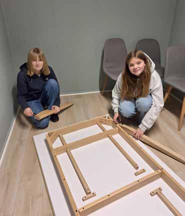 Line Aasbrenn og Vilde Romenstad skrur møbler til kontoret.