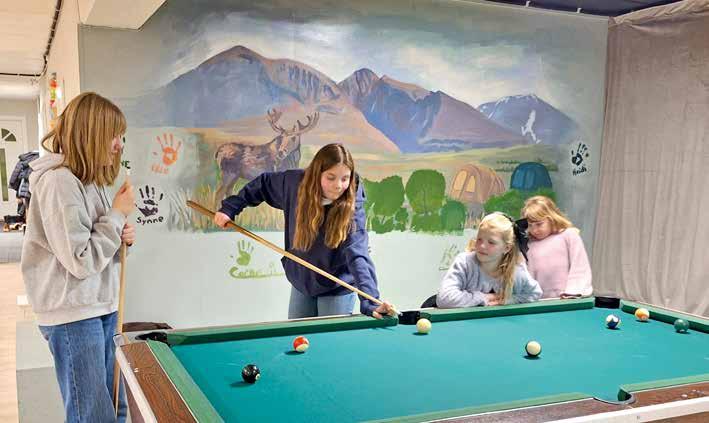 Line Aasbrenn og Vilde Romenstad tester ut det nyoppussede biljardbordet, mens to av klubbens yngste medlemmer, Vilma Nygård og Elvira Gjølga, følger spent med.