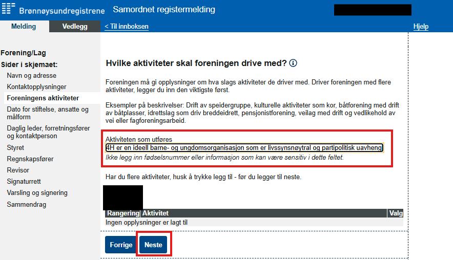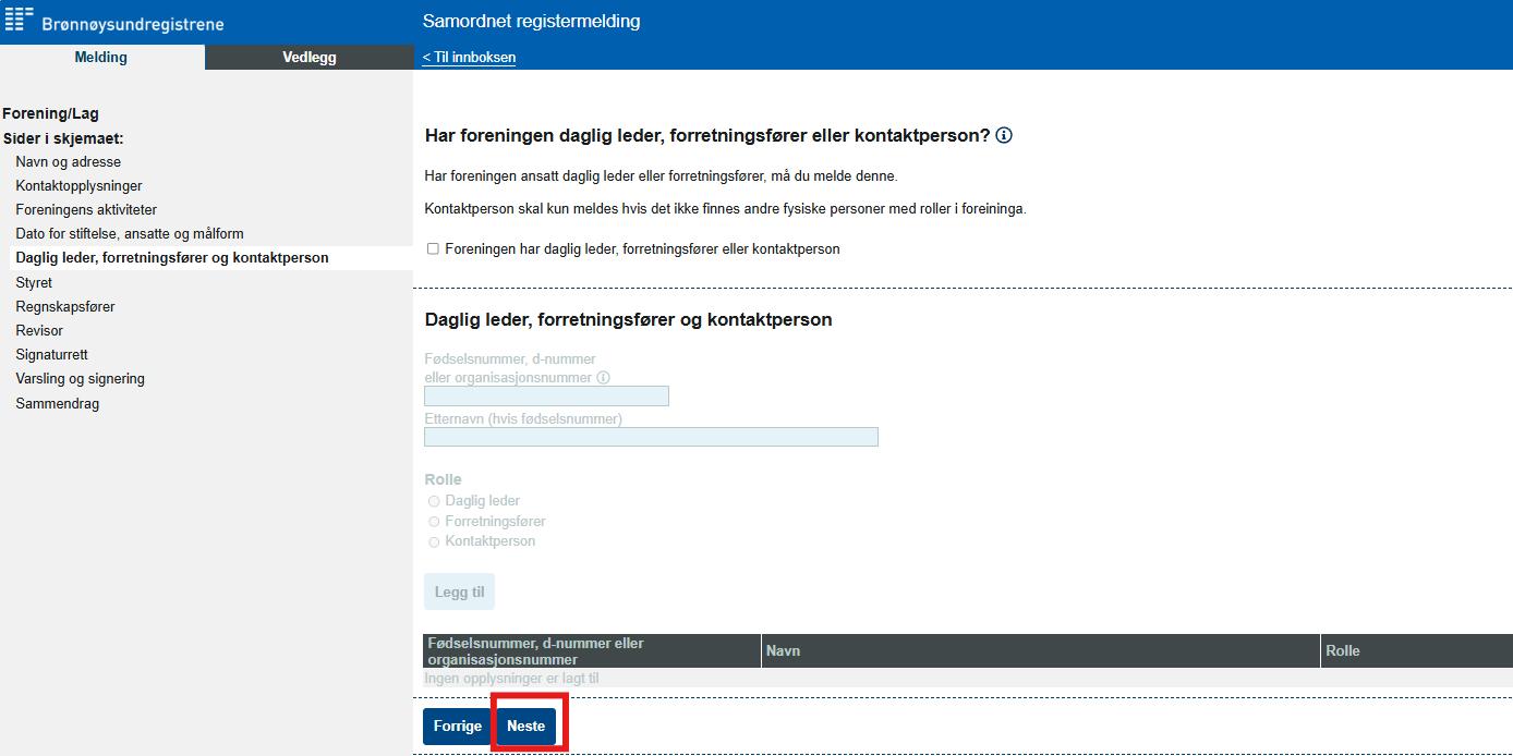 På neste side skal du skrive inn din egen e-post eller tlf.nr slik at du får varsel om registermeldingen. Også må du velge hvem som skal signere skjema. De med signaturrett kommer automatisk opp her. Trykk så på neste.