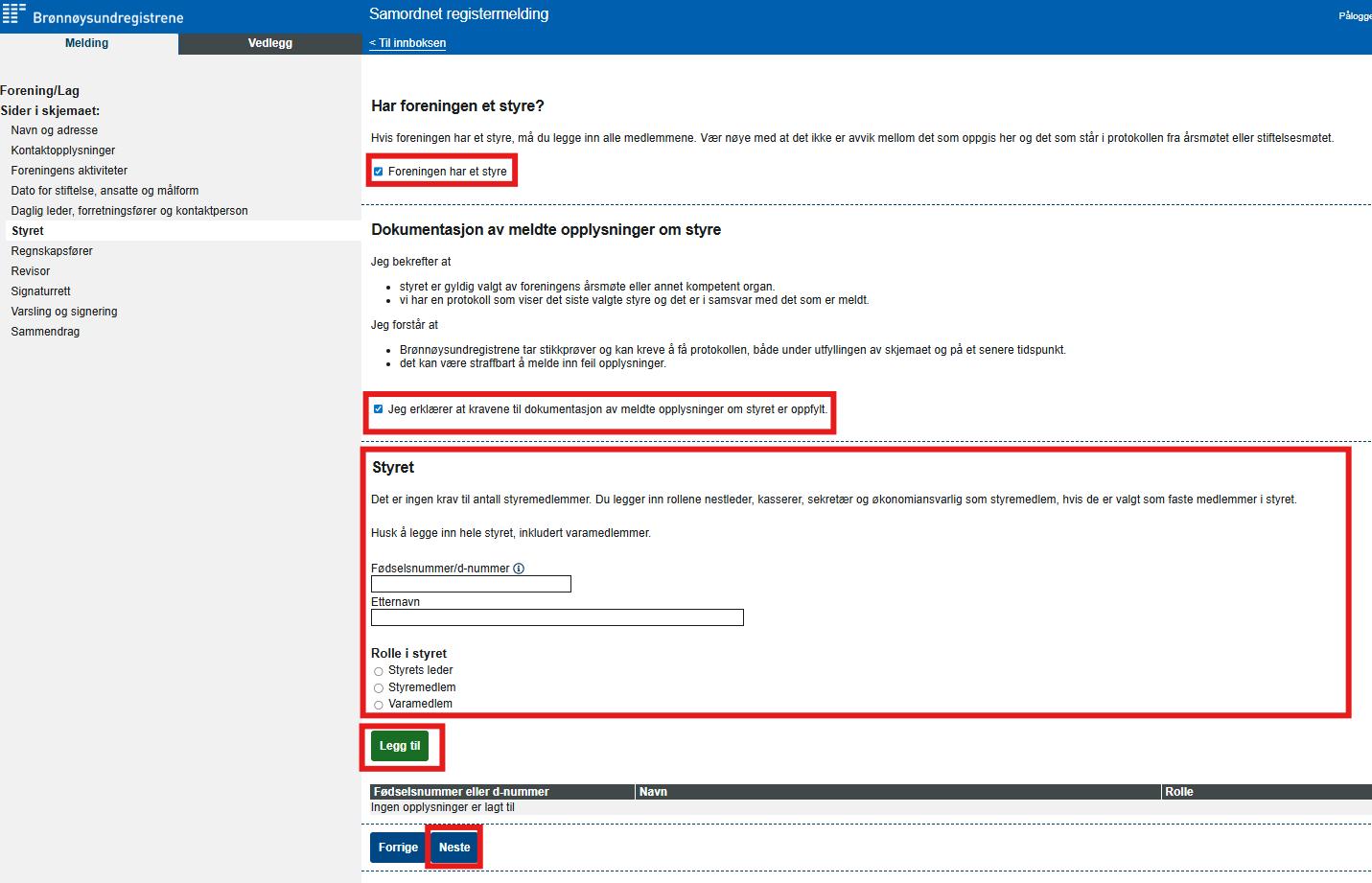 Du trenger personnummeret til alle styremedlemmer (inkl. eventuelle varamedlemmer), og til de med signaturrett (klubbrådgiver A + en valgfri myndig person, valgt på klubbens årsmøte).