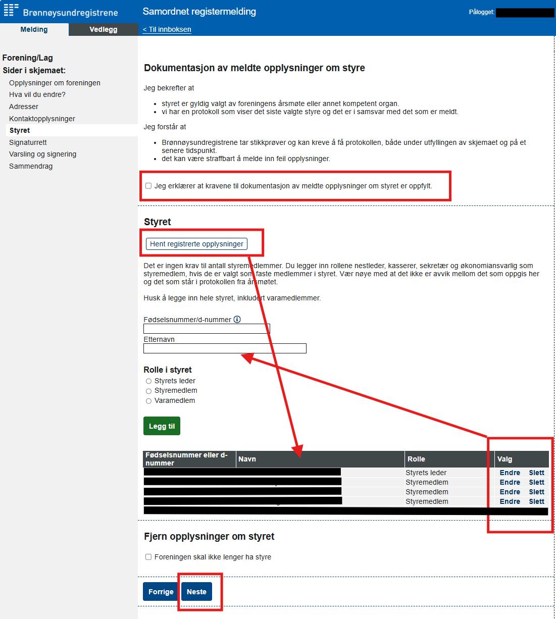Huk av at du bekrefter og forstår. Klikk «hent registrerte opplysninger». Endre navn og rolle.