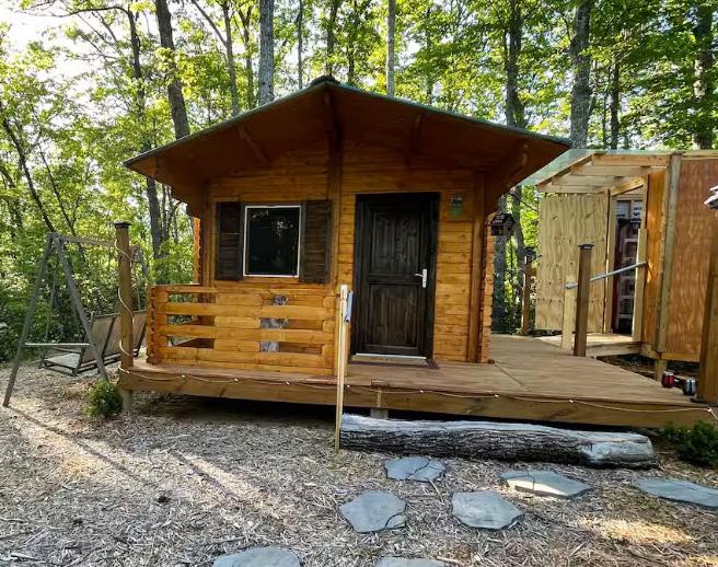 The Sasquatch Inn is a heavily wooded primitive cabin that sits on 32 acres in the Mountains of Western North Carolina. Great views of the smoky mountains and walking trails to explore! This is a hike-in/hikeout camping site with a few essential amenities. Park in the lower drive and hike in/up approximately 1/4 mile. We can also ferry your gear to and from the parking area. There is no electricity at the cabin, however we do have solar lighting.