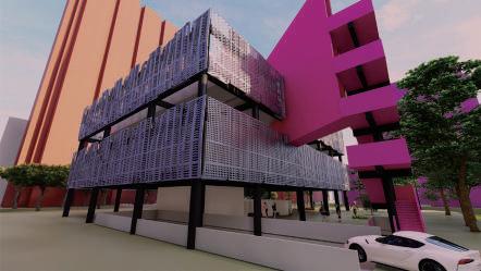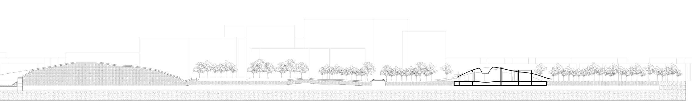 第一層平面為街道,無車化的街道。提供自 行車、滑板、行人使用。地面因此純粹化。 市集因此回到街上,讓街道互動熱絡起來。
