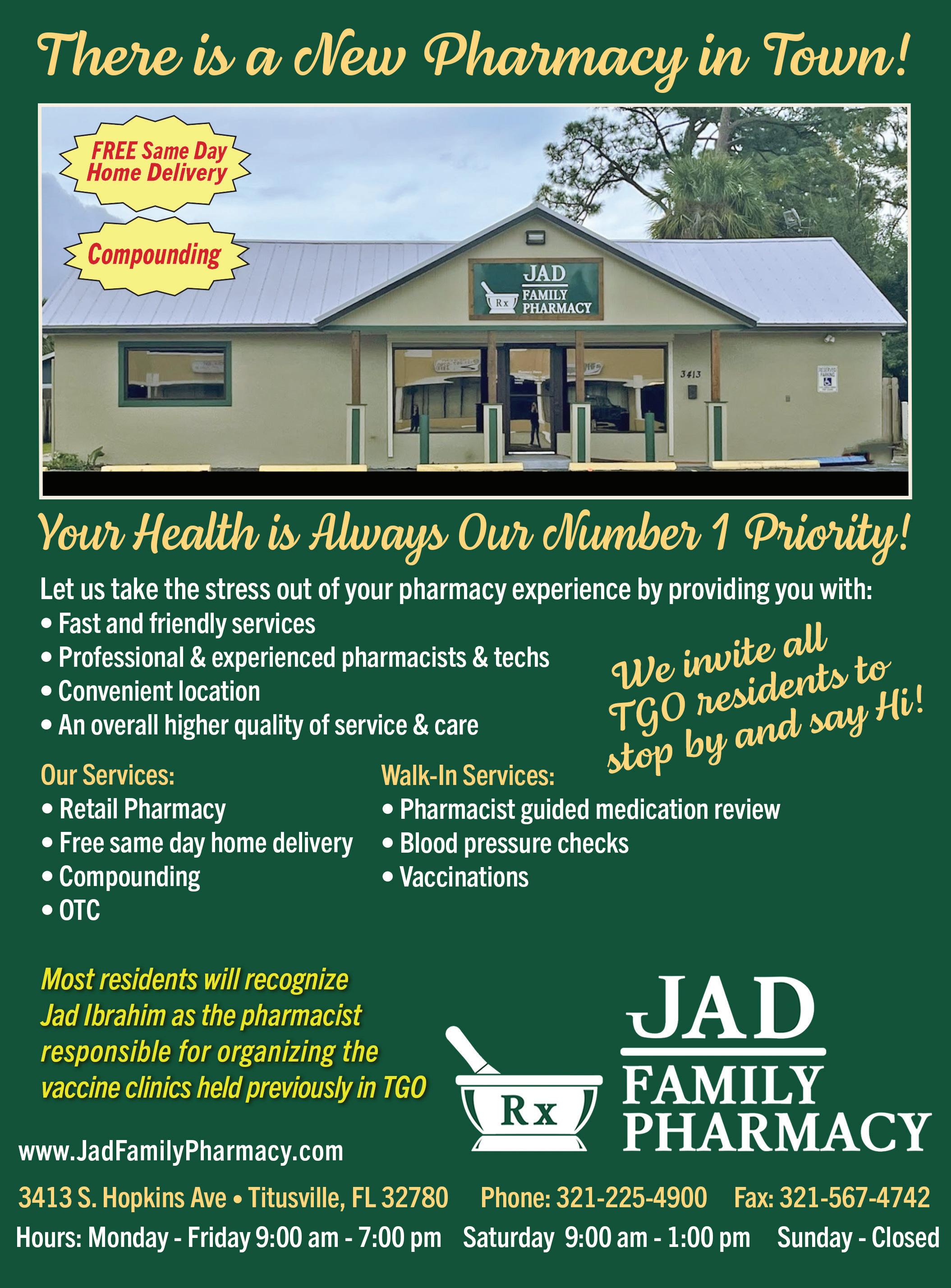 For your health and convenience, we are hosting a Flu and Vaccine Shot Clinic here at TGO on Tuesday, September 24th from 1pm-4pm in The Pavilion. Jads Pharmacy, a local pharmacy in Titusville and regular advertiser in The Happenings, will host this complimentary clinic onsite for us. Later in the fall, when many more of our residents are here, we are planning a larger health-fair event exclusively for those health-related services who advertise in The Happenings. More information about the September shot-clinic is available in this issue of The Happenings