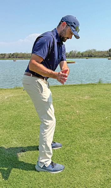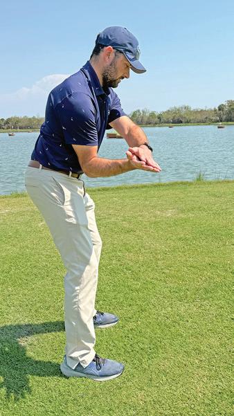 Set up as if you were going to hit a 6-iron, but without a club. Let your arms hang naturally, then place your palms together in a relaxed position. Without moving your chest or shoulders, swing your arms back and forth three times, allowing your elbows to bend and your arms to move freely.
