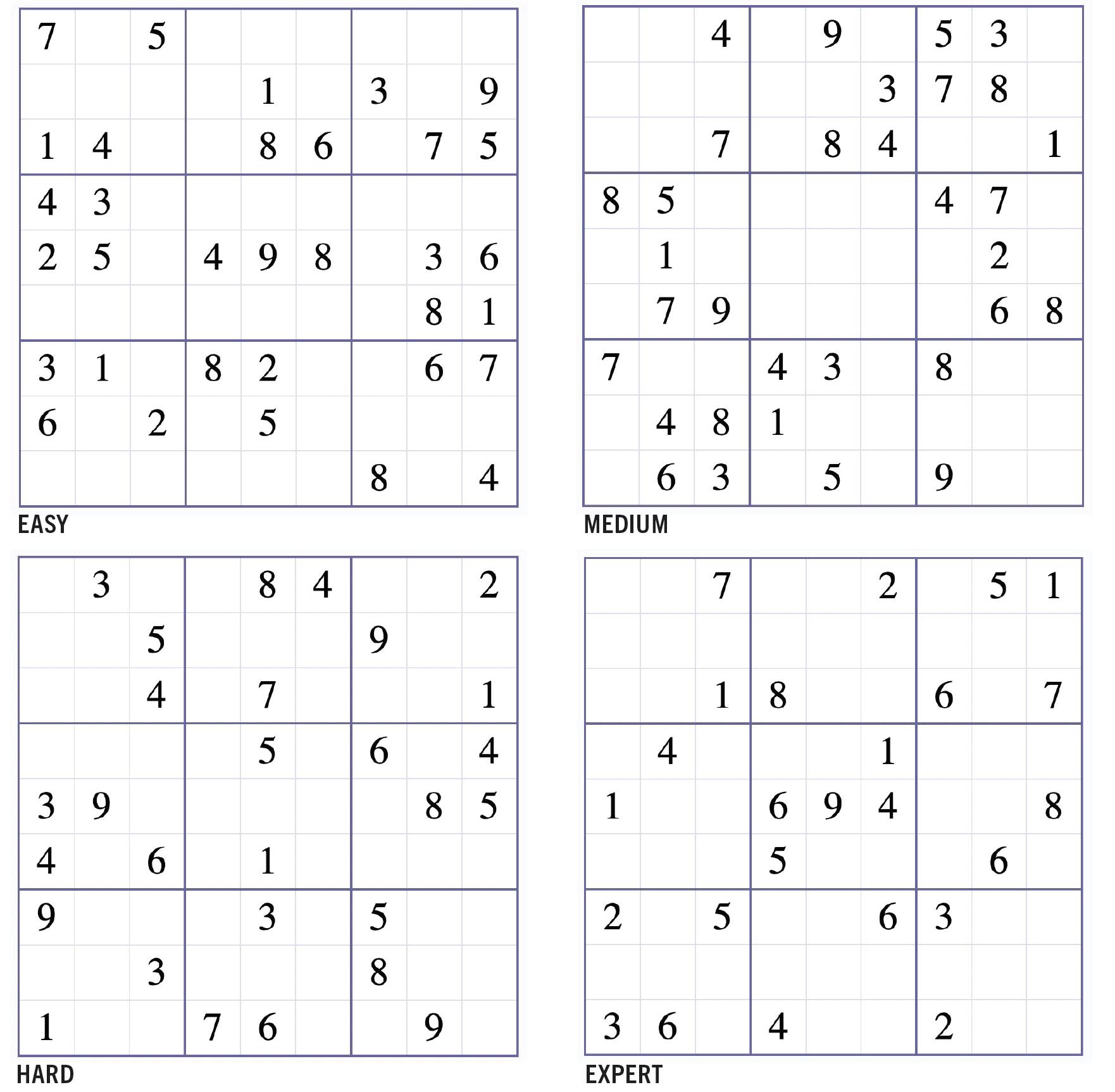 SUDOKU puzzles have one solution that can be reached logically without guessing. Enter digits from 1 to 9 into the blank spaces. Every row, column, and 3x3 square must contain one of each digit.