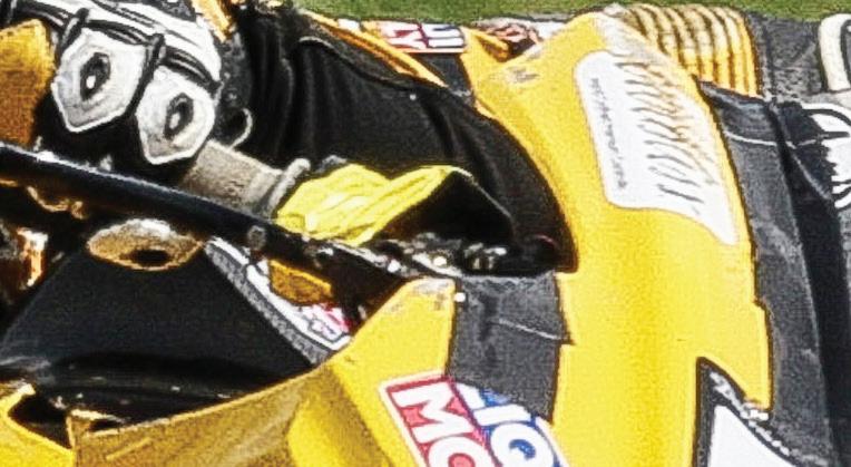 The flattened exhaust silencer was removed in favor of a new one that would more efficiently extract spent combustibles from the engine. The screaming yellow zonker also lost one of its aerodynamic wings, and the handlebar controls were pretty much FUBAR, including the front brake master cylinder and the buttons used to actuate and control various electronic controls and devices.