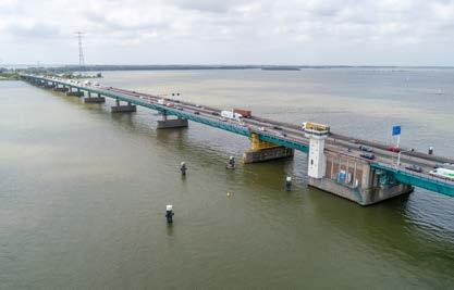 nauwkeurig, een precisiewerk. “We hebben de 2 grootste drijvende bok ken van Nederland gereserveerd om de brug in te hijsen in de periode dat de brug dicht is voor het verkeer. En al is het materieel en materiaal groot en log, het dek moet op 1 mm nauwkeu rig worden geplaatst, anders kan de brug niet goed open en dicht.”