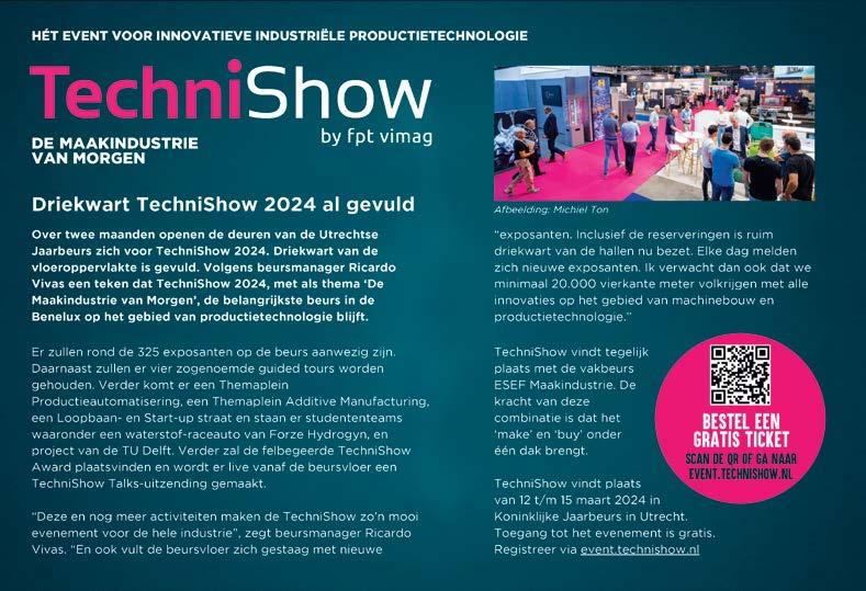 Met het thema ‘De Maakindustrie van Morgen’ pakken honderden exposanten op de TechniShow van 12 tot en met 15 maart groots uit met machines en demonstraties om hun innovaties, nieuwe technieken en oplossingen te laten zien. Tegelijkertijd laten exposanten op ESEF Maakindustrie in Jaarbeurs Utrecht zien hoe de maakindustrie omgaat met onderwerpen als digitalisering, robotisering en verduurzaming.