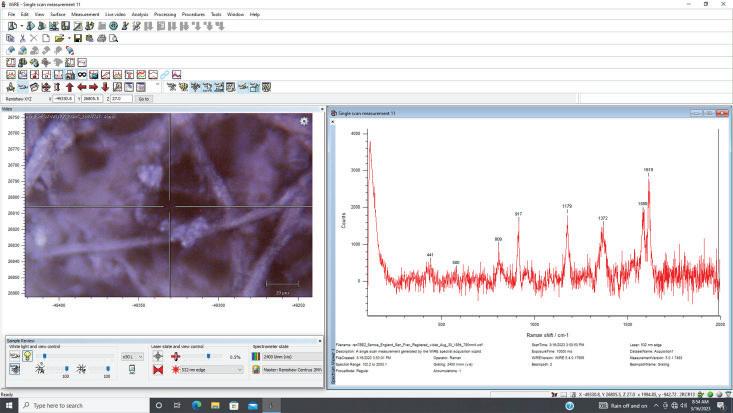 Figure 20. Sender’s fountain pen ink magnified x50 and the raw Raman spectrum. The 785nm laser used at 0.1% power or 1.459 milliwatts, 10sec. scan time, with one scan taken. This is iron gall ink. The raw spectrum is shown with its baseline corrected; it will be matched for peak alignment to a current commercial sample in the Ink3 library.