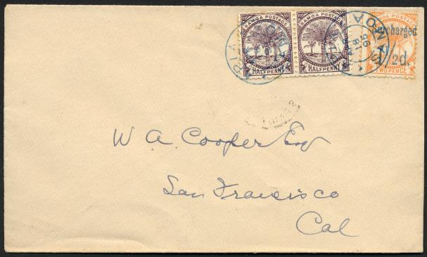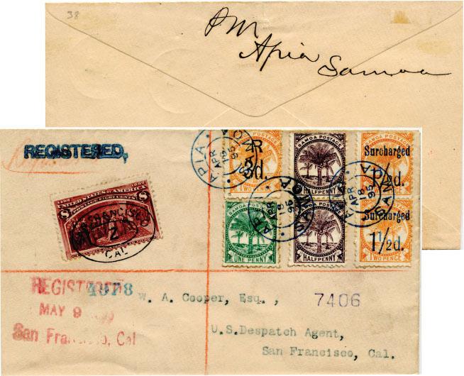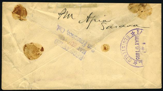 On arrival in Apia, all covers were handled by Postmaster Davis, and treated as if they had originated from Apia itself. The stamps were canceled with the Apia datestamp of “18 APR 95” and the registered cover was also struck with the “REGISTERED.” marking. Both cancellations are struck in blue. The reason for the blue color is because the normal black inkpad was destroyed in the fire and a provisional one in blue was used until a new black inkpad arrived, along with the new stamps, on May 22.