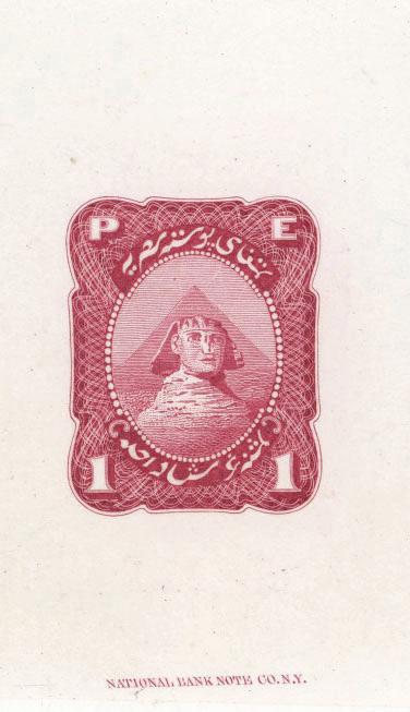 variously operated by the British, French and Italians; the British in particular had a keen interest in Egypt as a vital postal link to India, Australia and the Far East. By 1866 it was already clear that the newly established Khedivate would be taking control of its own postal services, and several parties began jockeying for a contract to print Egyptian stamps. A number of beautiful essays survive from this time, produced as far afield as Genoa, Florence, Paris, London and New York. Some of them are quite intricate, including some marvelously detailed three-color vignettes. The large die proof shown here (with enlarged detail) was prepared in 1867 in New York City by the National Bank Note Co., as an essay for a 1-piaster stamp depicting the Great Pyramid and Sphinx of Giza. Note that the Sphinx’s feet are still covered in sand; their excavation would not begin until the 1870s. NBNC did not obtain the contract, which went instead to the firm of Penasson in Alexandria. According to Feldman, Chalhoub’s collection of Egypt is considered the most comprehensive ever formed. Many of the more than 300 essays and proofs in this sale trace their provenance to past collections such as those of King Farouk, Britain’s Royal Philatelic Collection, Vahan Andonian and others. (Realization includes 23% buyer’s premium.)