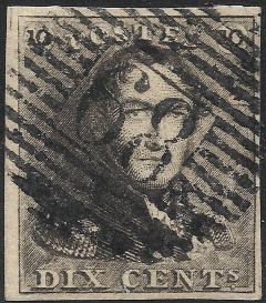 The stamp is a handsome thing to behold despite the devastatingly pervasive cancellation which is endemic to all of Belgium’s imperforate stamps; the Ministry’s regulations provided that each stamp had to receive a full strike of the circular canceler, which, it seems, put King Leopold I in a prison of ink.