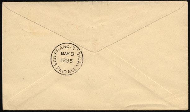 Postmaster Davis did not keep any U.S. 8¢ stamps at the Apia post office (as seen in Figure 1); they were normally applied and canceled by W.A. Cooper upon arrival in San Francisco. He did this in his position as the U.S. Despatch Agent. Postmaster Davis had to pay for the U.S. registration fee and that is the reason for the notation on the reverse of the cover; this was done so W.A. Cooper could put the cost for the U.S. stamps on the account of Postmaster Davis. The red dated San Francisco “Registered” marking was applied upon arrival in that city. A similar example to the Figure 1 cover (for postage accounting) is shown in Figure 4. It, too, bears the postmaster notation on its reverse. If you compare this cover to the Figure 1 example, it is quite clear that the non-registered cover has no postmaster notation, as there were no fees to be paid by Postmaster Davis.