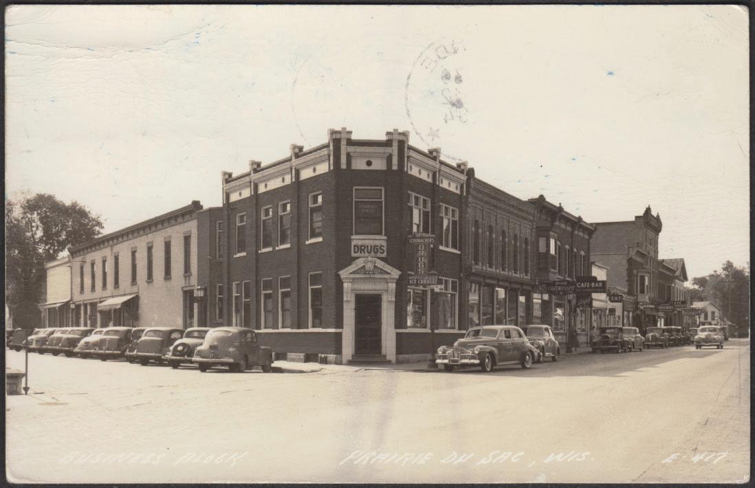 Upon turning the card over, I first noticed it is a real photo postcard, meaning it's printed on photographic paper. I also noticed the image appeared to be much older than the mailing. The street scene, depicted in Figure 2, reminded me more of American architectural features than European, and the 1930s-40s vehicles were definitely American. Then I saw it: the faint white lettering at the bottom of the card, reading “Business Block Prairie du Sac, Wis.,” which is the tiny village where I currently live! The current view of this part of town is shown in the Google image pictured in Figure 3. The tall building near the far right is the only structure that remains.