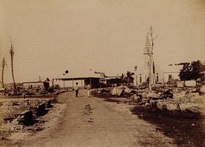 That cover (Figure 1) was originally prepared by W.A. Cooper himself; he wrote the full address, franked it with Samoan stamps previously bought from the Apia post office. He also made the red registration cross and wrote “Registered” in red in the upper-left corner. Several such items, including the cover shown in Figure 2, were made at the same time and they were all sent to Apia to be processed by Postmaster John Davis. The reason we know this is because the post office in Apia was completely destroyed by fire on April 1, 1895, when all stamps, except some 1 shilling stamps (later bisected and used), were destroyed. New supplies of stamps did not arrive until May 22. A scene after the fire is shown in Figure 3.