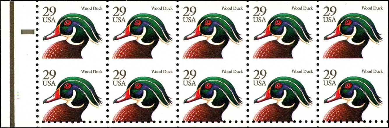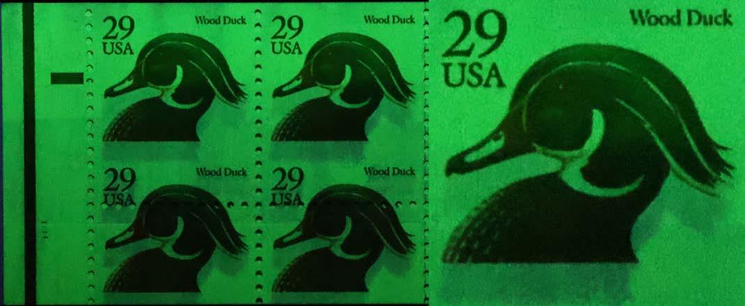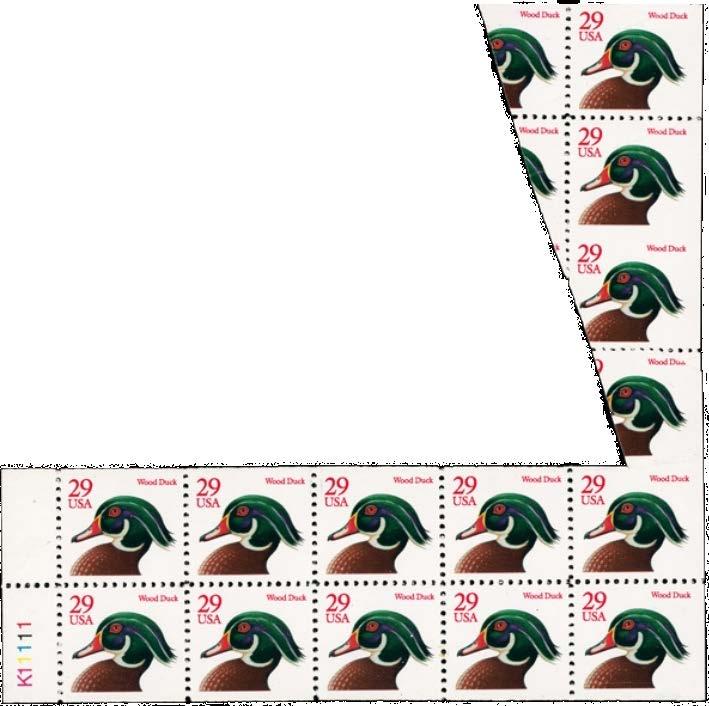 As with any booklet issue, there are various perforation freaks and errors on the duck issue. Panes exist with the horizontal perforation row shifted up or down by various amounts, up to shifts that create horizontal imperforate panes. Figure 9 shows an extreme downward shift. Such panes usually are described and offered in sales as horizontally imperforate. For the extreme booklet purists, the horizontal perforations just minimally touch the bottom design of the duck so the pane would not qualify as truly horizontally imperforate. You be the judge.