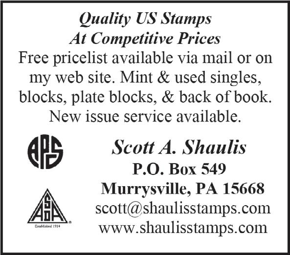 USSS MEMBERS are entitled to two free ads of up to 40 words each year. Other ads are 10¢ a word, payable in advance. For 6 insertions, take a 5% discount; for 12 insertions, take a 10% discount. Ads with [1154] at the end expire with this issue. Make checks payable to USSS. Send copy and check to The United States Specialist, 9038 E. 25th Dr., Denver CO 80238. The Editor strongly prefers to receive ad copy by email: editor@usstamps.org. Emailing ads saves substantial time for you and the Editor and avoids errors.
