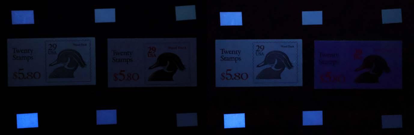 Tables 4 and 5 list the true reactions of the covers and panes for the various tagging combinations. Apparently many different paper and cardboard shipments were used to print the booklets, so there is a range of color shades within the booklet issue.