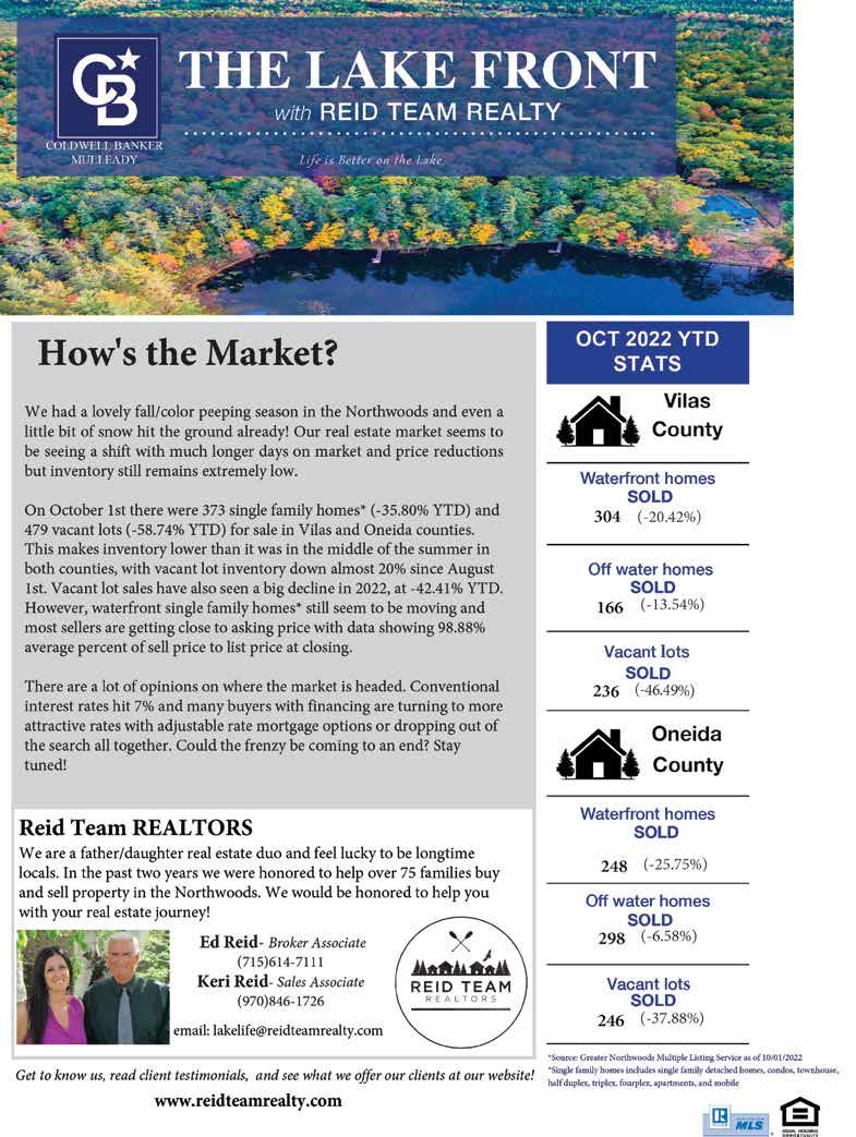 The #1 Brokerage in the Northwoods! 231 Oneida St. Downtown Minocqua 715.358.0450 Redman Realty GroupRedman Realty Group NORTHWOODS LIVING - LIVE THE LIFE YOU ALWAYS WANTED • 4BD, 3BA 4008 SQ.FT. Spacious Home • Large 3 season porch overlooks course • Family Room – Stone Fireplace • Timber Ridge Amenities MLS#199496 $399,900 7524 TRAILWOOD DR-TIMBER RIDGE “THE POGGEMANN TEAM” TeamPoggemann@RedmanRealtyGroup.com 60 years combined experience Mary Ellen & Bob Broker Associates 715.892.1761 TeamPoggemann@RedmanRealtyGroup.com • 2BD, 2BA, 2128 SQ.FT. • Quiet In-Town Residential Area • Oversize 2 Car Garage • Many Recent Updates • Finished lower level family room, craft & exercise rooms MLS#199192 $269,000 1204 4th AVE-WOODRUFF, WI STAR LK RETREAT-TOWN OF PLUM LK • 3BD, 2BA, 2600 SQ.FT, 1.81 AC. • Outstanding Views of Beautiful Star Lake • Hand scribed Log Home with 250 year old huge Hemlock Logs • Black Slate and Wood Floors • Huge Fieldstone Fireplace • Potential income – used as AirB&B MLS# 199541 $650,000 We design & distribute marketing pieces for your business! Contact us today! • Distribution • Ad Design • Magazines • Catalogs • Visitor Guides • Area Maps • Brochures • Rack Cards • Business Cards • Plus So Much More! You Dream it We Design it 409 South Park Dr. • Tomahawk, WI 54487 715-453-4511 • info@5StarUpNorth.com 5StarUpNorth.com 12