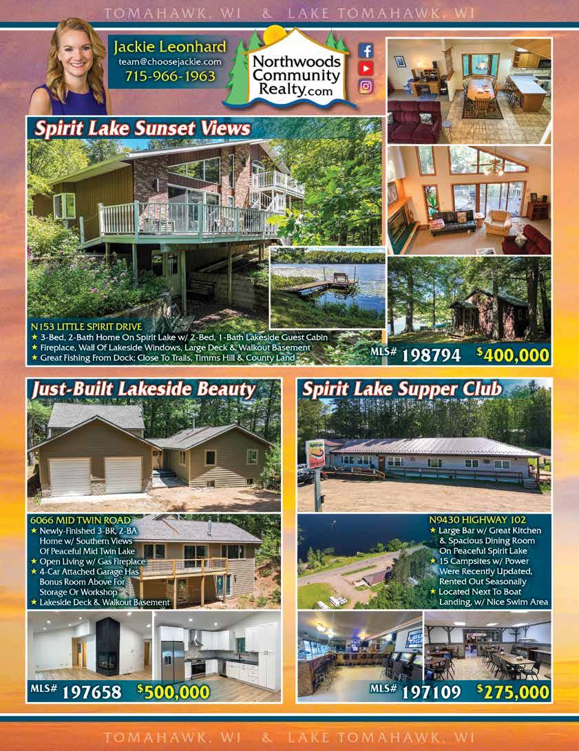 WATERFRONT HOMES COMMERCIALOFF WATER VACANT LOT DESIREABLE MINOCQUA INVESTMENT MLS #198702 $225,000 • Commercial building w/visibility on Hwy 51 • Well established business location on corner lot • Uniquely designed w/Northwoods appeal • 3 Stone fireplaces, wood flooring, spacious rooms • Updated bathrooms, new windows & more! • Basement storage & 1 car garage w/extra storage • Paved parking and nicely landscaped. BUSINESS OR INVESTMENT OPPORTUNITY MLS #198008 $449,000 • Woodesign Custom Furnishings • Contemporary & Northwoods Decor • Seller will pass on 25 years of expertise • Heated workshop w/office & Bathroom • 48x64 Metal Barn & New 48x63 Schley Bldg. • Close to town & high-speed internet • Also a perfect rental investment property! MINOCQUA MLS#199038 $22,900 • Timber Ridge Golf Course Community • Build home overlooking 15th hole • Utilities located at the parcel • Amenities: golf course, pool & club house • Close to town & Bearskin Trail OFF WATER HOMES TOMAHAWK RIVER MLS#199106 $230,000 • 3BR Home w/4 wooded acres on Tomahawk River • Zoned Business B-2 for business endeavors • Currently used as a rental investment • Perfect for your Northwoods home or build new • High speed internet is available at this location • Easy access and close to town for amenities MINOCQUA LAKE MLS#199066 $590,000 • Magnificent Bay View 2BR/2BA Condo • Western views of the lake & close to town • Open concept floor plan w/stone gas FP • Private covered balcony overlooking lake • Quality products throughout the condo • Drive under 2 car gar w/private elevator HOME IN PERFECT LOCATION MLS#199070 $219,900 • 3BR/2BA Ranch home close to recreation • Close to snowmobile & ATV trails • Little Arbor Vitae Lake is just down the road • Open KT & DR, spacious Living Room • MBR w/BA & built-in dressers, ML laundry • 2 Car att garage & high-speed internet available HOME & INVESTMENT PROPERTY MLS#199170 $419,000 • Home & 40x60 Pole Building w/heated shop • Zoned Community Business for home-based business • Huge bonus room w/wood beams for multi-use • Cathedral ceiling, gas stove & length of home deck • MBR w/BA, walk-in closet & Spa Room • Walk out LL ready to finish & close to State Land OAK PARK ESTATES CUSTOM HOME MLS#199274 $410,000 • 4BR/3BA Newer ranch home close to town • Open concept, cathedral ceiling & gas stove • MBR suite with MBA and walk-in closet • LL partially finished w/family room, BR & BA • Att 2 car gar, fenced yard, sprinkler sys & landscaped • City water & sewer, natural gas & high-speed internet 16