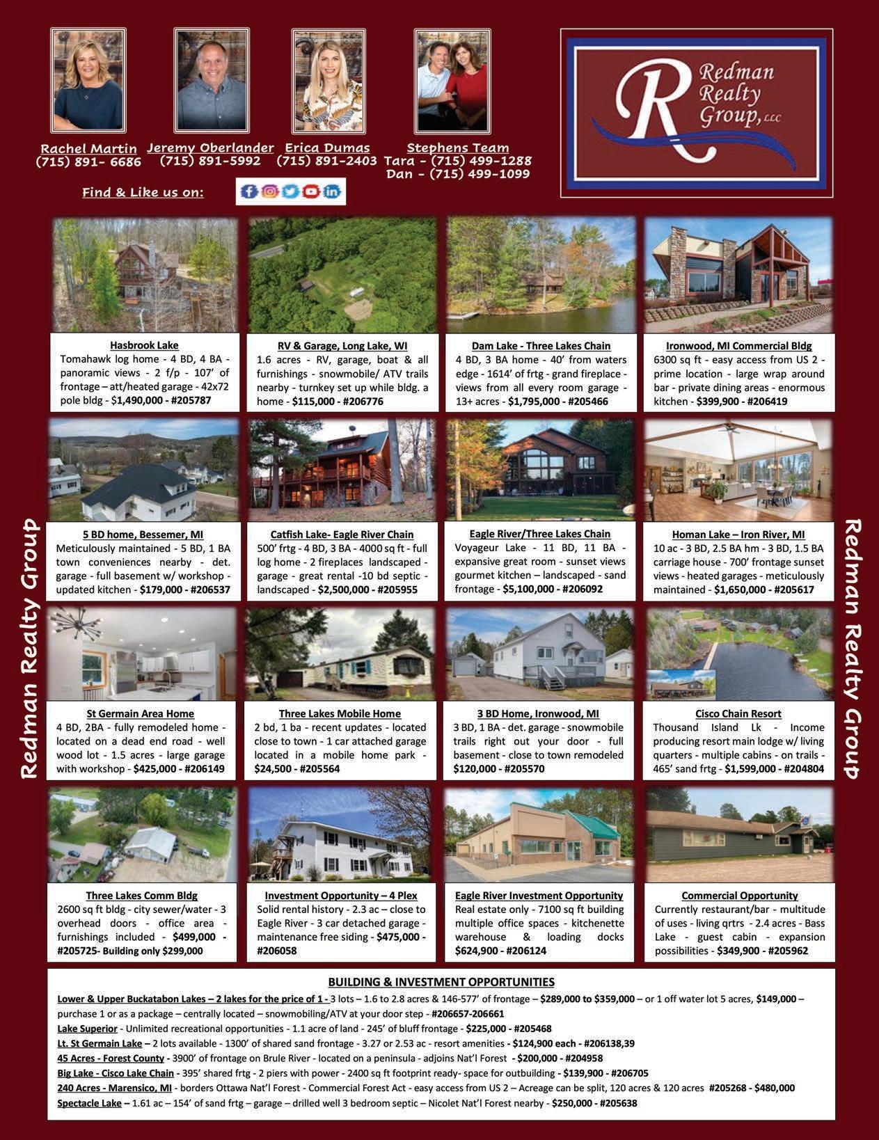 4 BR, 2 BA log home, space for large groups. Currently in a rental program. Sportsmen’s Paradise surrounded by State Land, snowmobile, and ATV trails. $675,000. MLS 205840