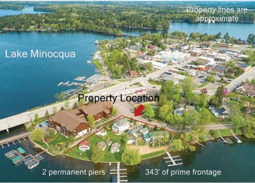 Minocqua-Experience the charm of a century-old historic home at the heart of a magni cent resort nestled on the shores of Lake Minocqua. e 4BD/1.5 BA original home boasts timeless elegance with its grand entrance, stained glass and wellpreserved wood details, taking you back in time while o ering modern comfort. Surrounding this piece of history are 4 inviting waterfront cottages, 6 well-appointed kitchenette units & a duplex. A harmonious blend of prestige, tradition and convenience, with a prime location that o ers Southern exposure and 343 ft. of sand frontage on Lake Minocqua. Walking distance to shopping, dining & nightlife, the location cannot be beat. 2 permanent piers to house all watercraft when you’re not enjoying the 6,000 AC of recreational waters that are right at your ngertips. is resort is a rare gem, promising an idyllic retreat for those seeking a unique lakeside escape for their family. Rental history proves strong with generations of families who have enjoyed this property for years, making it possible for the new owner to continue to run as a resort if desired. Alternately, this resort is an ideal investment for those seeking opportunity. e potential for redevelopment opens doors to creating what a new owner envisions in this scenic location. Favorable zoning will allow for continuation as a commercial endeavor, resort, condominiums, marina...all will be possible here. LakeMinocquaResort.com. MLS # 205499 $5,200,000