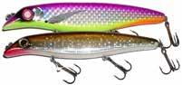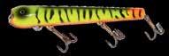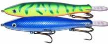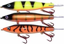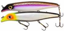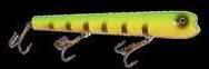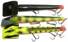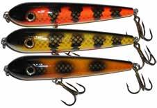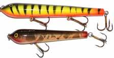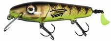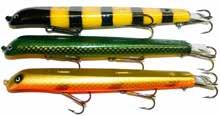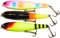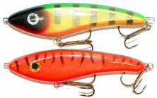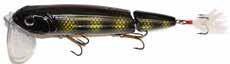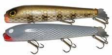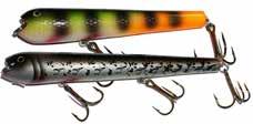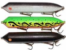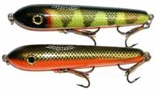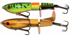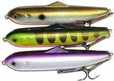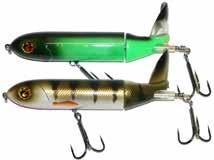BUCHER WALKIN RAIDER: With its side to side sweeping action on top, the walkin raider is as easy to use as its sub surface brother, the glide raider. Tough, plastic construction and over size treble hooks mean trouble for toothy predators!