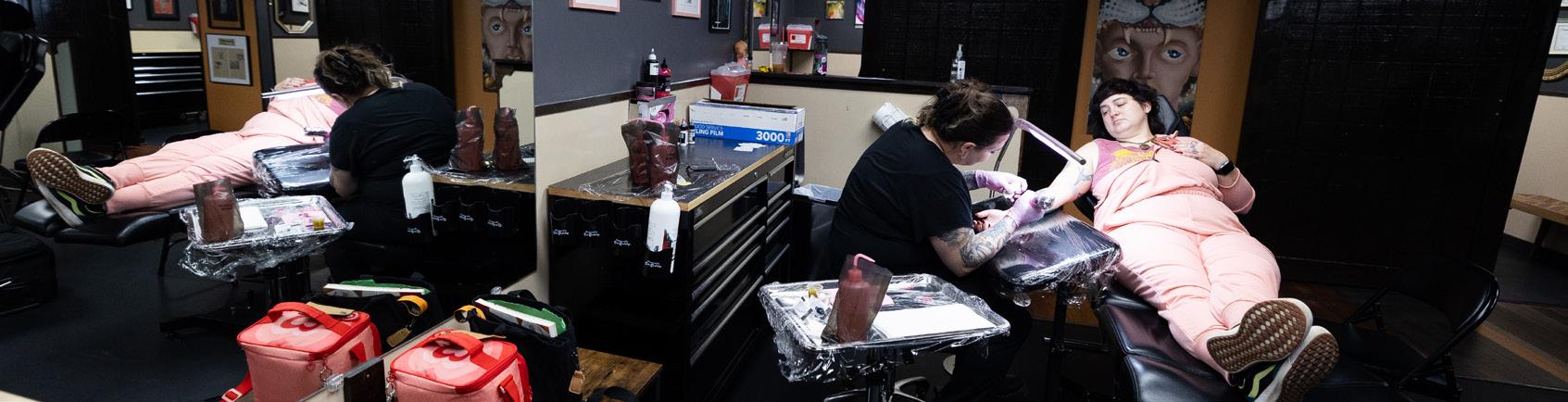 Thus began the apprenticeship program at Evolved, which Markham is currently wrapping up after having started in 2021. The beginning of the program focuses heavily on hygiene and best practices, covering topics like cross-contamination and infectious disease awareness. “I started from scratch and it was definitely scary for a few months,” said Markham. “But we have the whole shop helping and supporting us. They helped me learn how to focus and understand the techniques of tattooing.” Artists in the program start with drawing designs and artwork on paper, then practice extensively on lifelike silicone “skins” before moving to real people. →