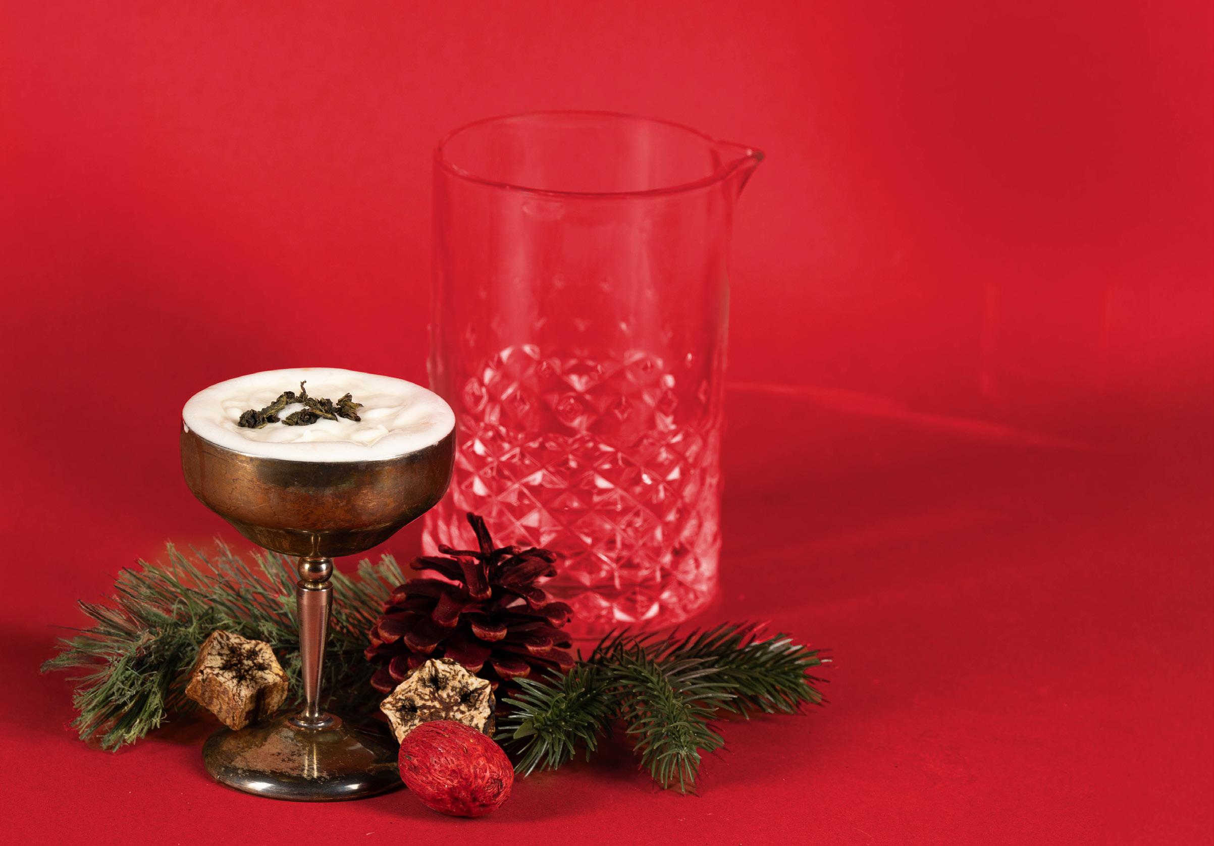 Top with tiki bitters and oolong cream