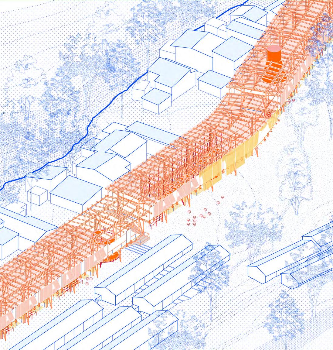 The construction of the ring infrastructure uses both vernacular and recycled materials such as bamboo for the structure and recycled corrugated sheets for the roofs.The design also integrate traditional textiles allowing weavers and sellers to hang their products on the facade and interior partitions. This approach creates a showcase of local production and culture within the architecture.