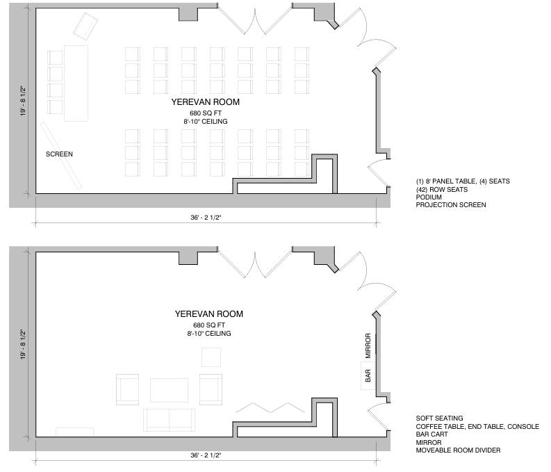 The Yerevan Room, encompassing 780 sq. ft., serves as a versatile space—perfect as a VIP room, bridal suite, small meeting space or intimate gathering.