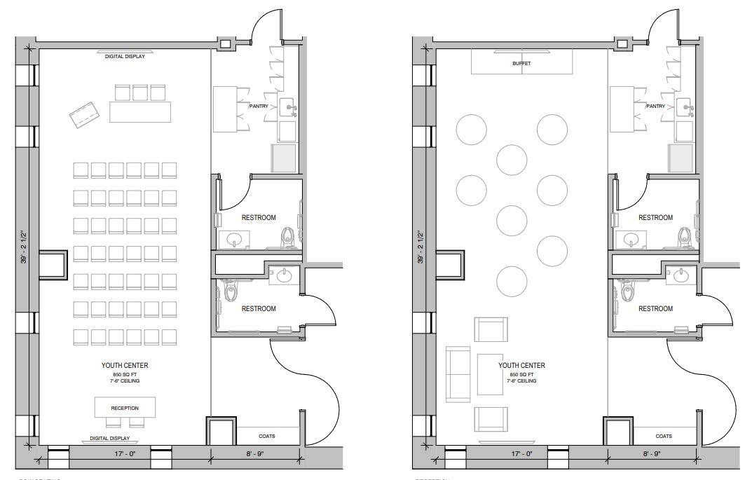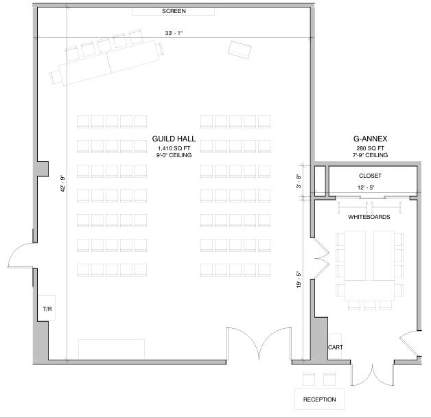 Guild Hall, including its adjacent 250 sq. ft. Annex offers 1,410 sq. ft. of fully equipped space featuring a surround sound system and Apple TV. An ideal setting for meetings or smaller celebrations.