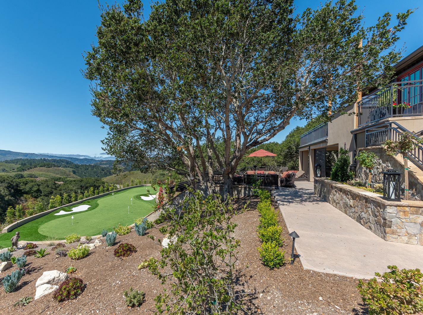The space sits on 10 acres and has nine fireplaces, two outdoor kitchens, a sixhole custom putting green, and expansive tile patios, including off the primary bedroom, with views of the ocean. The walls are plastered in the Venetian style—hand troweled.