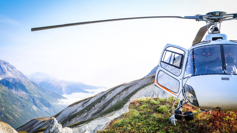 majestic backdrop of towering mountains, vast glaciers, ice fields, and pristine waters. Observing these magnificent creatures in their natural habitats is a quintessential Alaskan experience. Captain Crusty (aka Steven Moe, the lodge’s owner) is the best host one could wish for. His itineraries include helicopter access to places one would never be able to see by land, the most abundant fishing spots, and lunch on top of a glacier—freshly caught, grilled salmon, washed down with a bottle of Cristal. There is nothing quite like enjoying a glass of champagne on top of a mountain, surrounded by light blue ice fields, crystal clear water, and wildflowers.