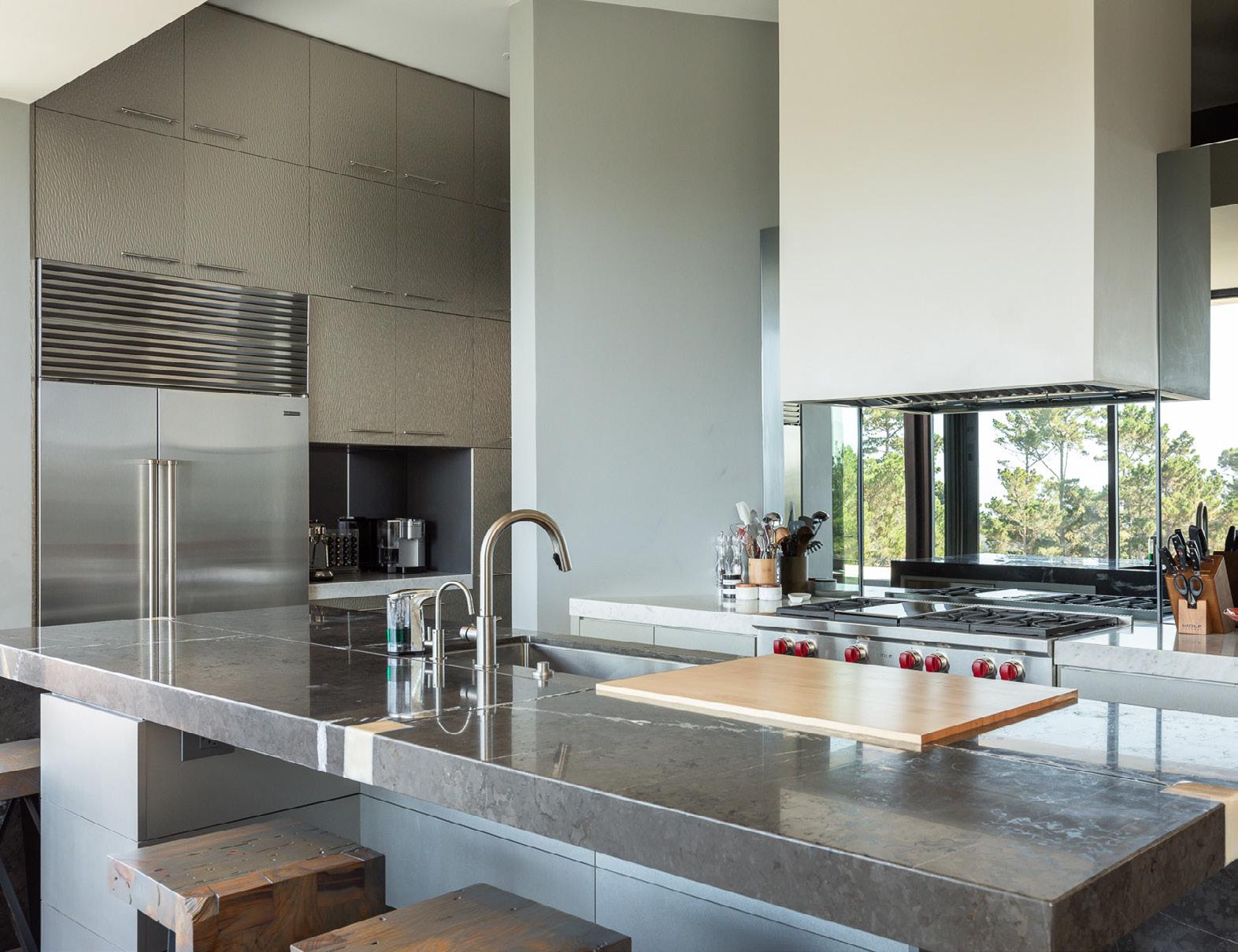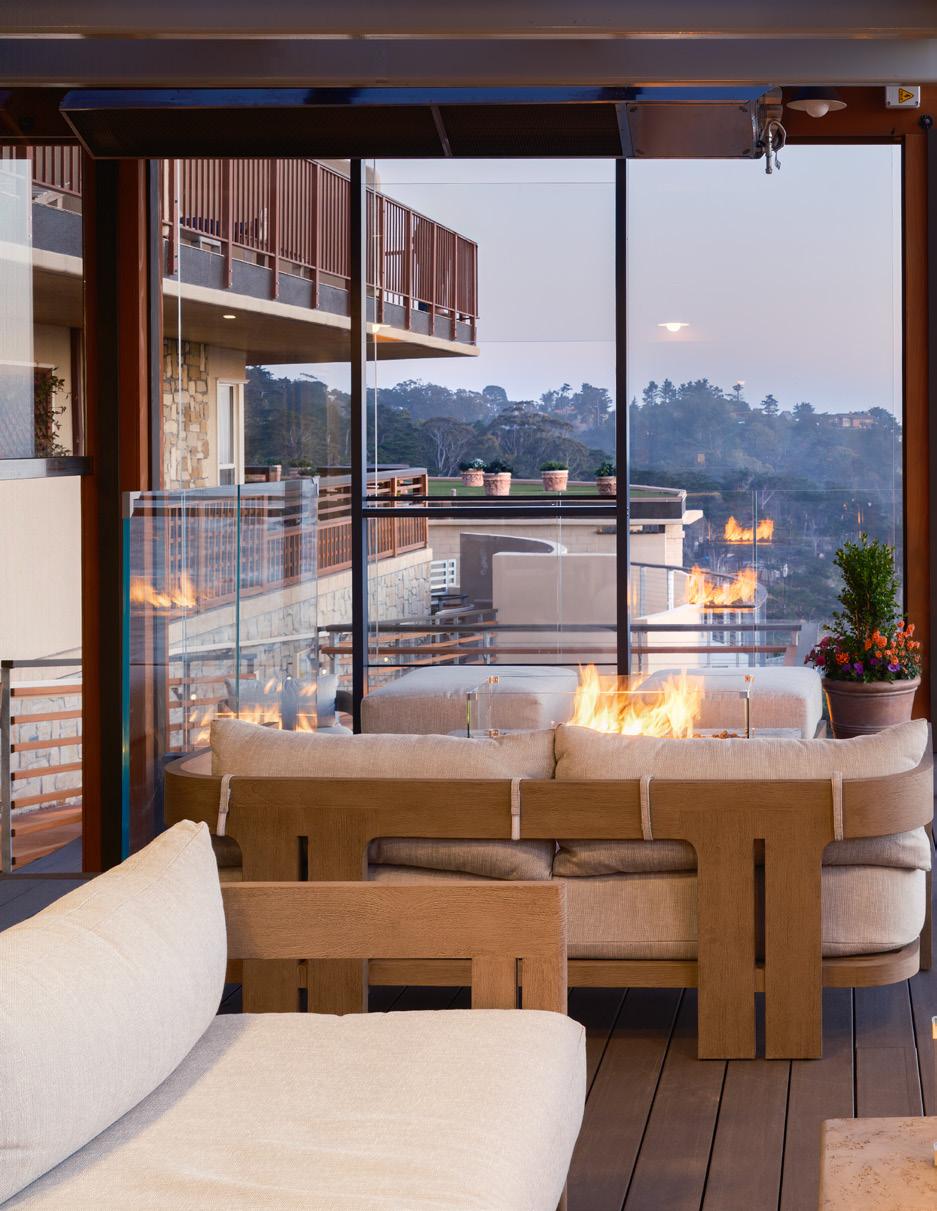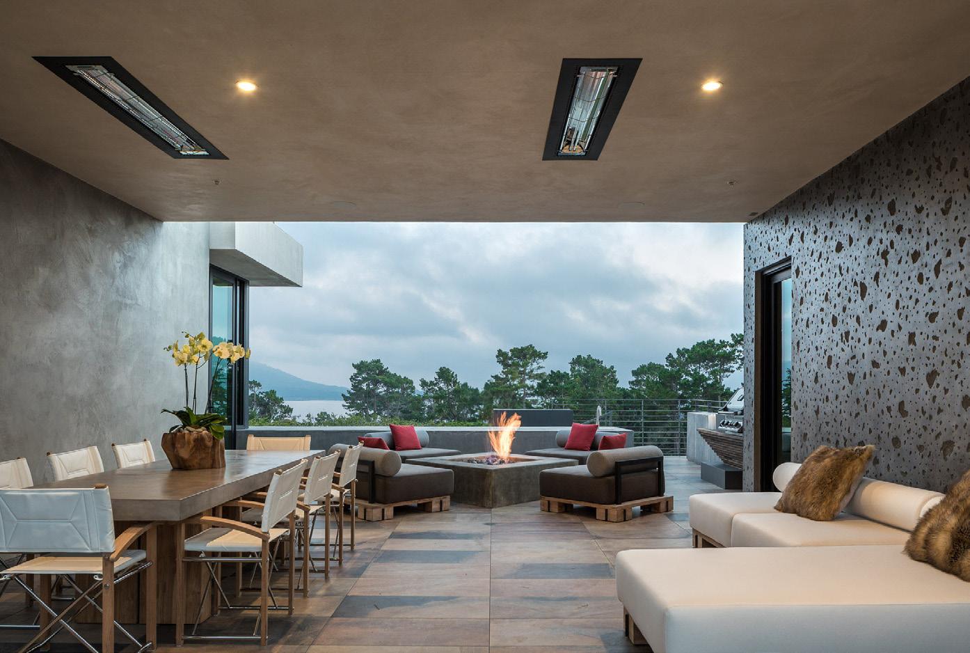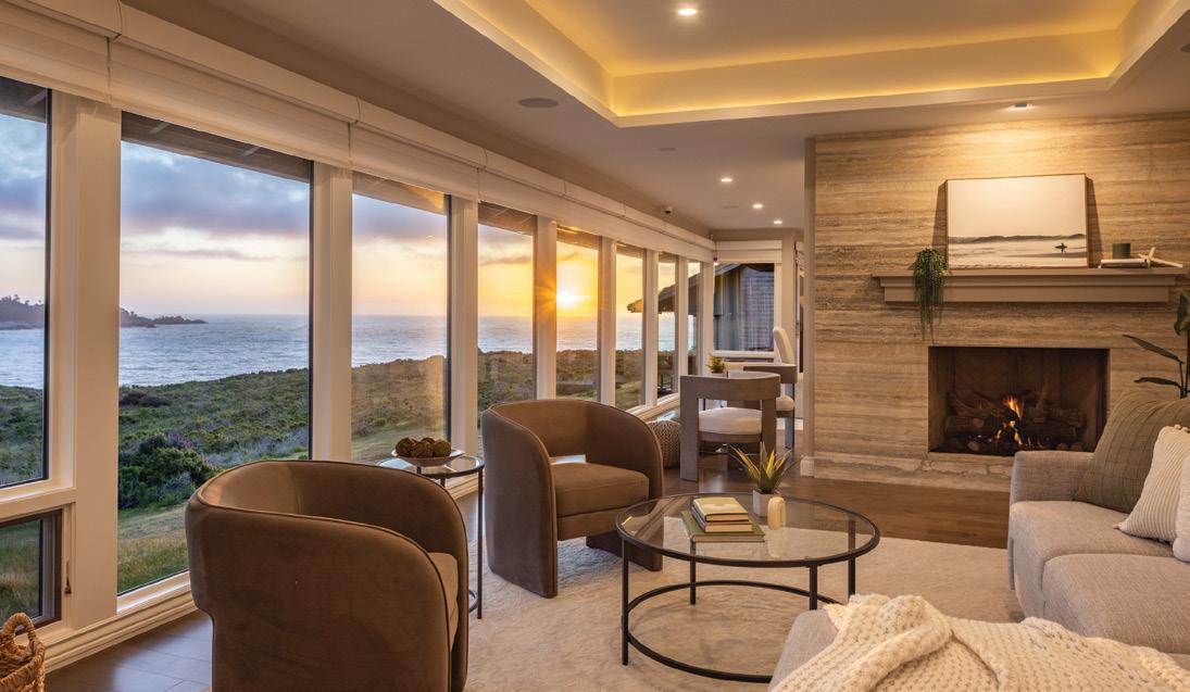 Designed by Conrad Asturi Studios, the 4,176-square-foot home features four bedrooms and four-and-a-half baths. The property is close to The Lodge at Pebble Beach and features an expansive ocean view and stunning landscape. With two fire pits, concrete terraces, and a breezeway, the home is the perfect spot for outdoor entertaining.