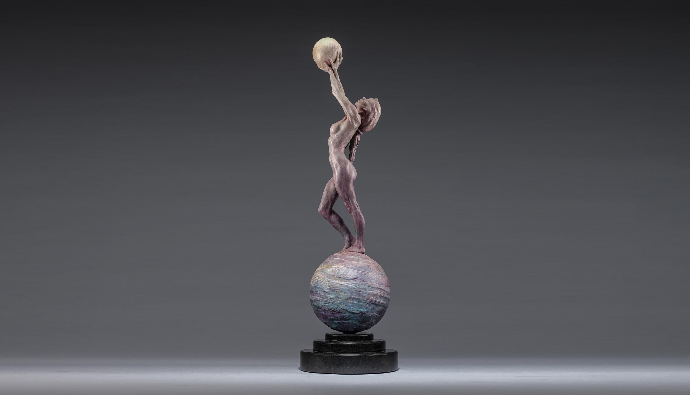 The mythological goddess of the light and of the moon, is a symbolic expression of the divine power, strength and grace of the feminine form. Diana stands confidently above the earth, while gracefully holding the moon in her hands. She is physically seductive and emotionally ethereal; solid as the earth and as mysterious as the moon. Diana Earth & Moon, Third Life bronze