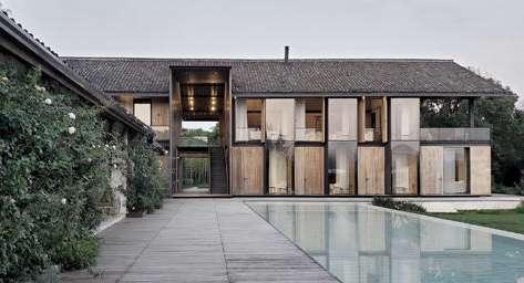 The project is settled perpendicularly to the existing farm to create a dialogue between the two buildings while a terrace and a swimming pool are connecting the two entities together.