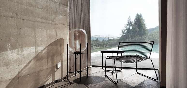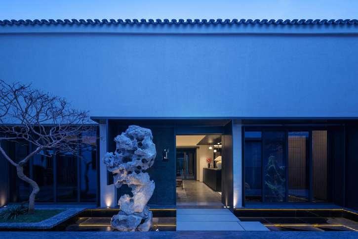 The screen divides the space softly and the bathtub is placed beside the courtyard. The room lighting system is connected in series on the structural frame,